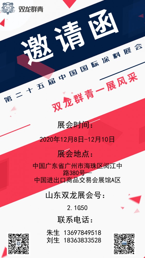 山東龍口雙龍化工將攜明星產(chǎn)品雙龍群青亮相2020中國國際涂料展歡迎各界朋友的持續(xù)關(guān)注!我們一起共同期待本次展會(huì)的精彩呈現(xiàn)!![]()