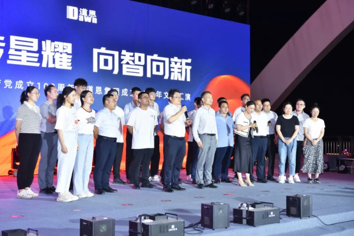 6月28日,走進龍口市道恩新材料科技產(chǎn)業(yè)園,彩旗招展,一派喜慶氛圍。當天晚上,道恩人歡聚道恩橋,隆重舉行以“薪傳星耀 向智向新”為主題的慶祝中國共產(chǎn)黨成立103周年暨道恩集團成立33周年文藝匯演。
